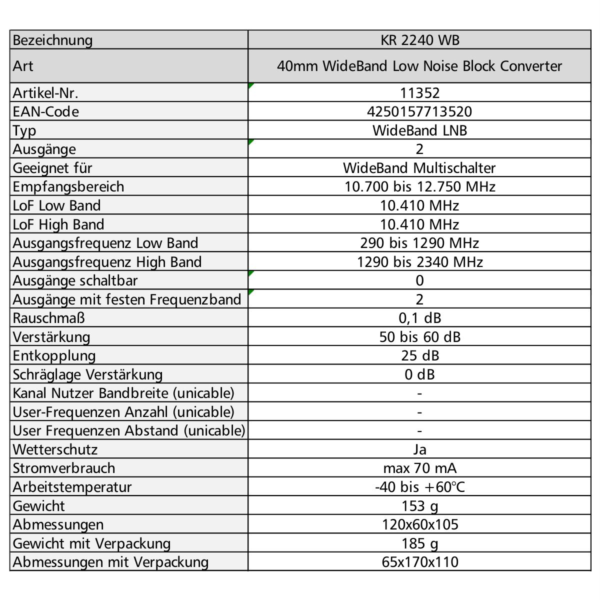Wideband LNB mit 40 mm Feedaufnahme zur Einspeisung in Wideband-Multischalter. 2 Ausgänge (1 x Vertikal, 1 x Horizontal) Kommt in Unicable oder Glasfaser Anlagen zum Einsatz.